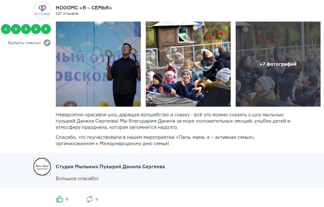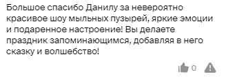 Большое спасибо Данилу за невероятно красивое шоу мыльных пузырей, яркие эмоции и подаренное настроение! Вы делаете праздник запоминающимся, добавляя в него сказку и волшебство!