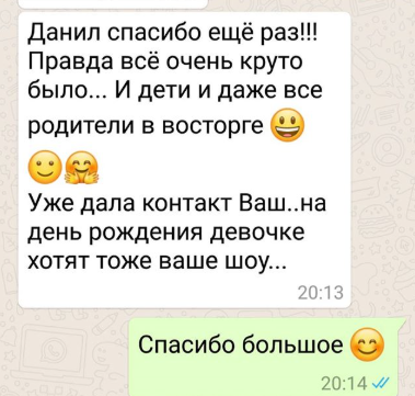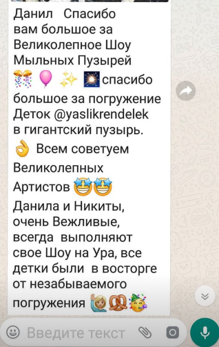 Данил, спасибо вам большое за великолепное шоу мыльных пузырей. Спасибо за погружение деток в гигантский пузырь. Всем советую великолепного артиста Данила и его помощника Никиту. Очень вежливые, всегда выполняют своё шоу на ура. все детки были в восторге от незабываемого шоу.