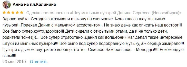 Здравствуйте. Сегодня заказывали в школу на окончание 1-ого класса шоу мыльных пузырей. Приехал Данил с мальчиком ассистентом. Не знаю даже как описать наш восторг!!! Всё было супер, круто, здорово!!! Дети сидели с открытыми ртами, да и не только дети, родители тоже)))). Всё супер отработано. Данил как волшебник-маг делал такие интересные штуки из мыльных пузырей!!! Всё было под супер подобранную музыку, аж сердце замирало!!! Пузыри с дымом внутри - это вообще что-то. Спасибо Вам большое. Молодцы!!!! Рекомендую всем!!!!
