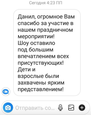 Данил, огромное Вам спасибо за участие в нашем праздничном мероприятии! Шоу оставило под большим впечатлением всех присутствующих! Дети и взрослые были захвачены ярким представлением!